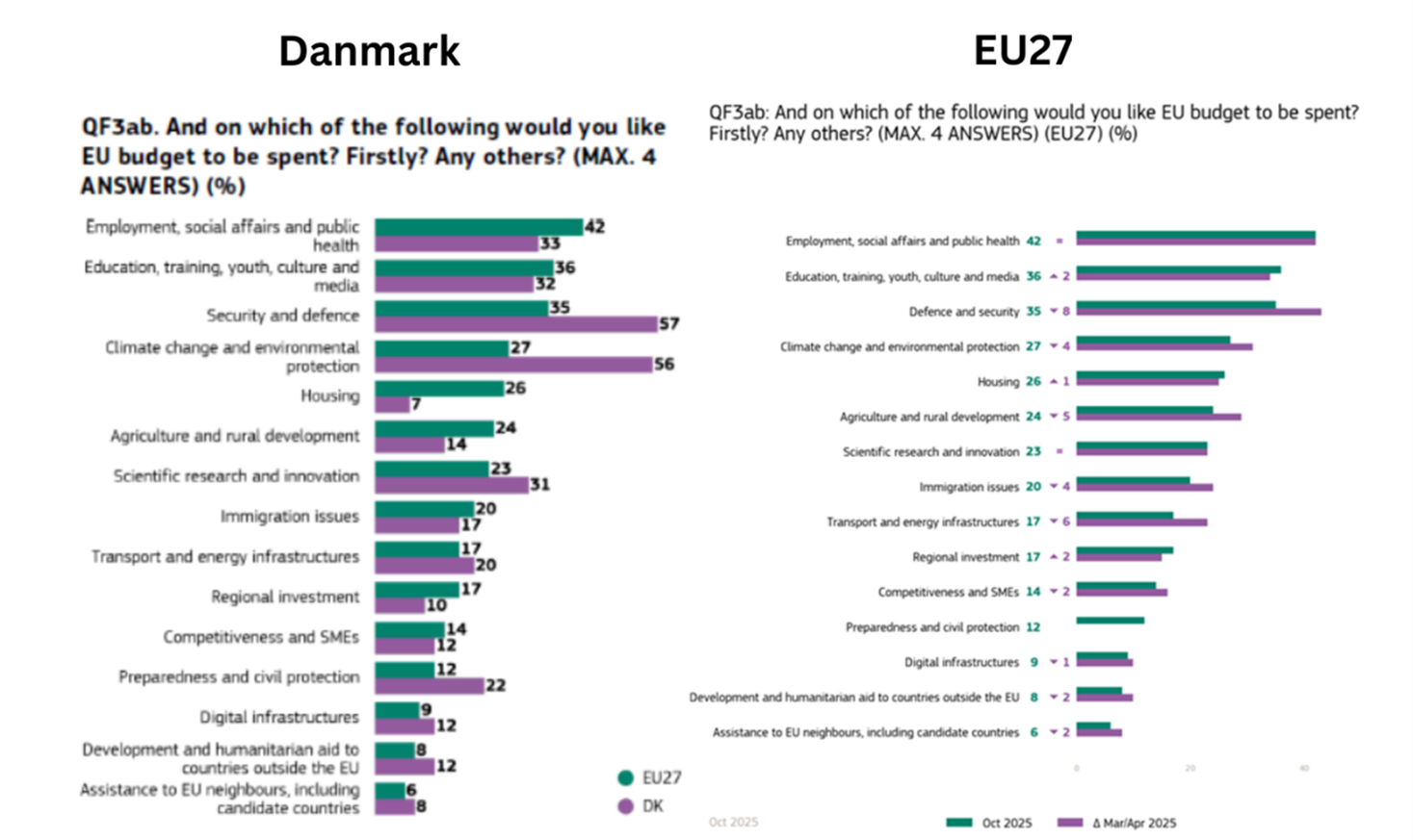 En markant forskel fra den generelle tendens i EU er måden hvorpå danskerne gerne vil prioritere EU’s budget. Som nedenstående tabel viser, er ’Education, training, youth, culture and media’, den anden højeste prioritet for EU’s 27 medlemslande, eftersom ’security and defence’ er faldet 8 procentpoint til 35 %. Her afviger Danmark markant hvor ’security and defence’ tager førstepladsen med 57 %. Førstepladsen for EU-27 er ’employment, social affairs and public health’ med 42 %. I Danmark er anden prioriteten ’Klima og miljøbeskyttelse’, som 56 % mener skulle prioriteres i EU’s budget.